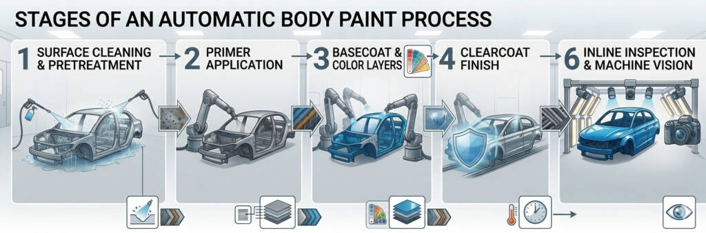Today, automatic car painting is no longer just about applying color to a vehicle body. It represents a sophisticated integration of robotics, intelligent inspection, and real-time analytics within a fully connected Industry 4.0 ecosystem. The paint shop has become one of the most technologically advanced areas of the entire production line.